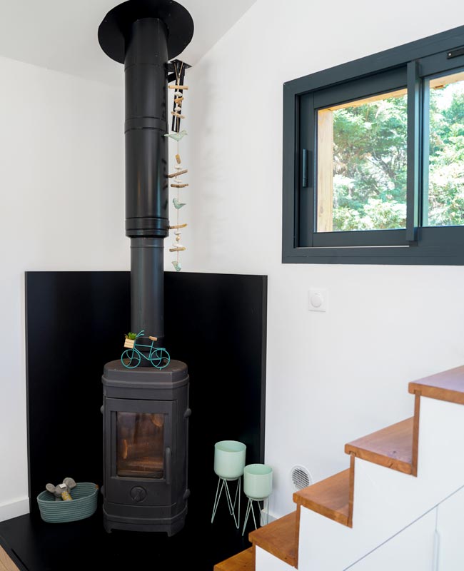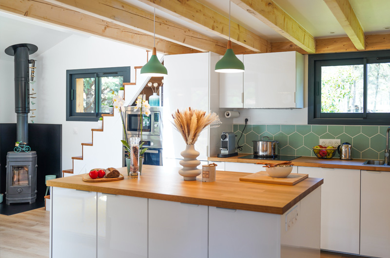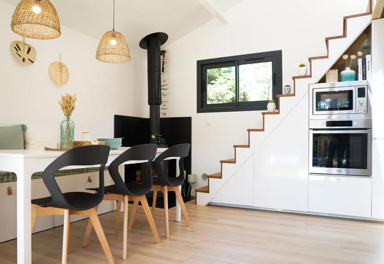 Natural light is enhanced with modern, larger openings that connect to the outdoor living area, while dark wooden and plastered walls were updated to white matte drywall, accented with natural wood elements. The custom kitchen, integrated under the stairs, features a central double-sided island for ample storage, with hidden storage in the dining bench trunk.