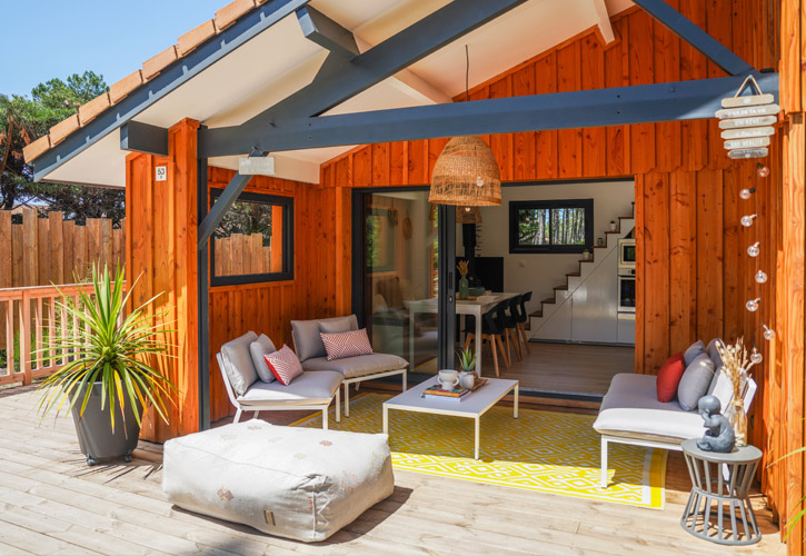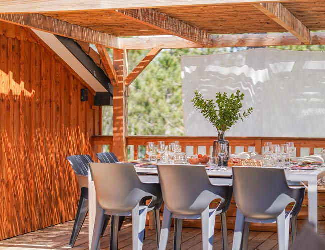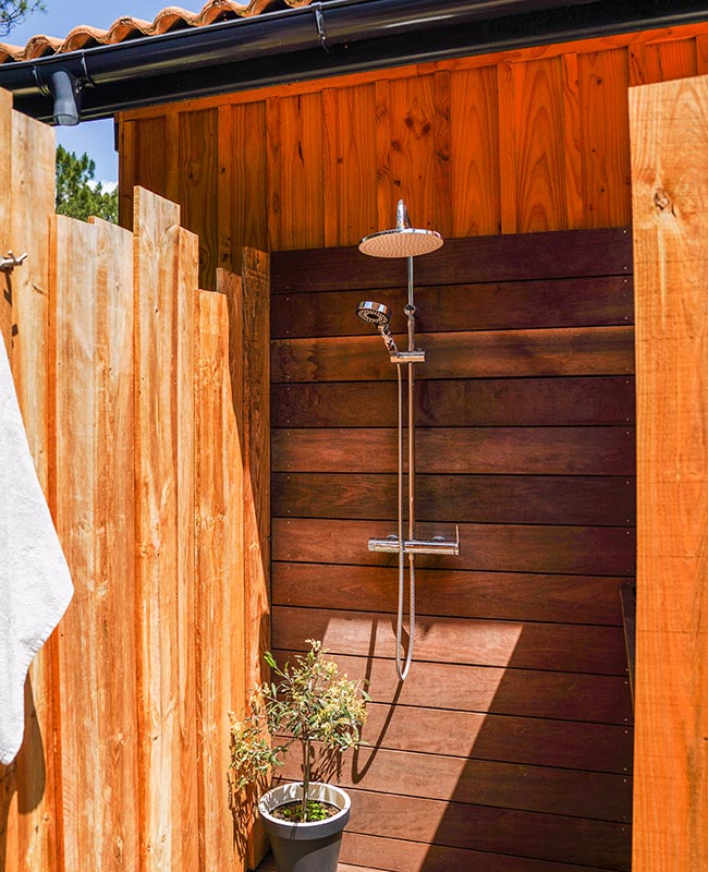 Nature-inspired elements unify the design with the surrounding pine landscape, and the wooden outdoor dining area, shower, and lounge create an inviting atmosphere perfect for a holiday retreat.