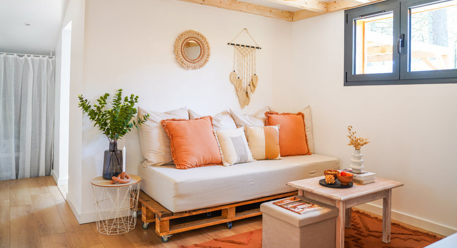 An indoor-outdoor feel with beach house vibes, emphasizing ergonomic design and natural light. The focus is on maximizing storage space while creating a significantly bigger, comfortable and inviting living area.