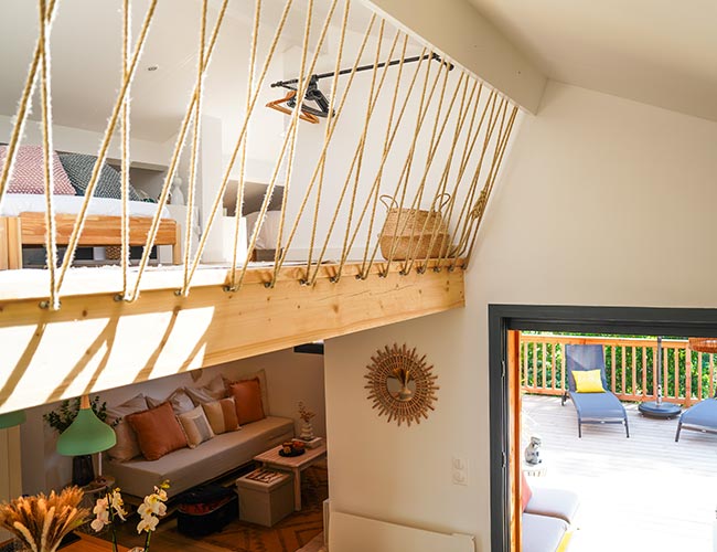 This stunning makeover maximizes space by removing walls and reorganizing the floor plan. In compliance with French coastal property restrictions, we added an extension, creating a new master bedroom and a chic bathroom in the transformed outdoor shed, complete with a double vanity, Italian shower, and small bathtub.